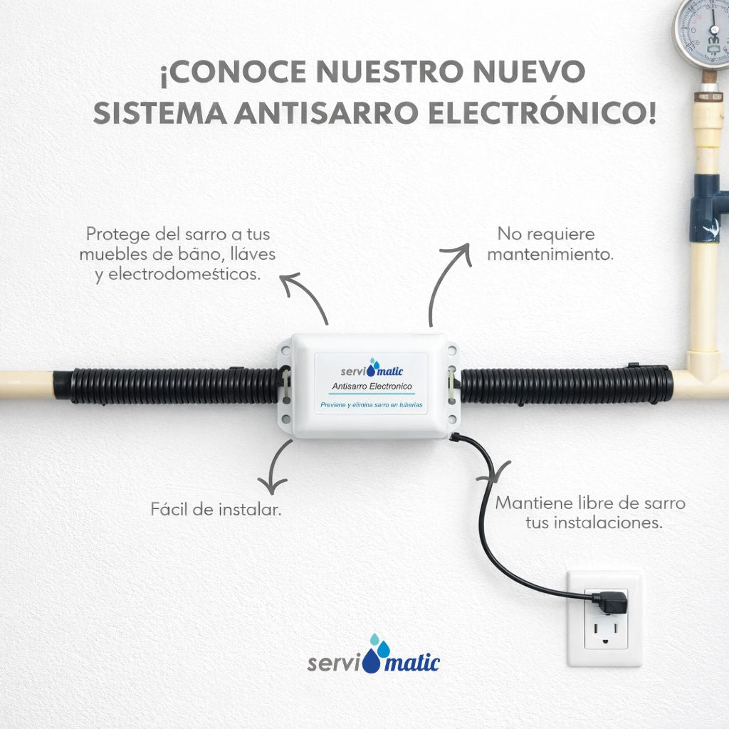El sistema Antisarro Electrónico Servimatic, es un desincrustador de sarro electromagnético. Evita la formación del sarro en las tuberías y que este se adhiera y afecte al flujo de agua en las tuberías. Así mismo, elimina gradualmente el sarro existente, de una manera ecológica.